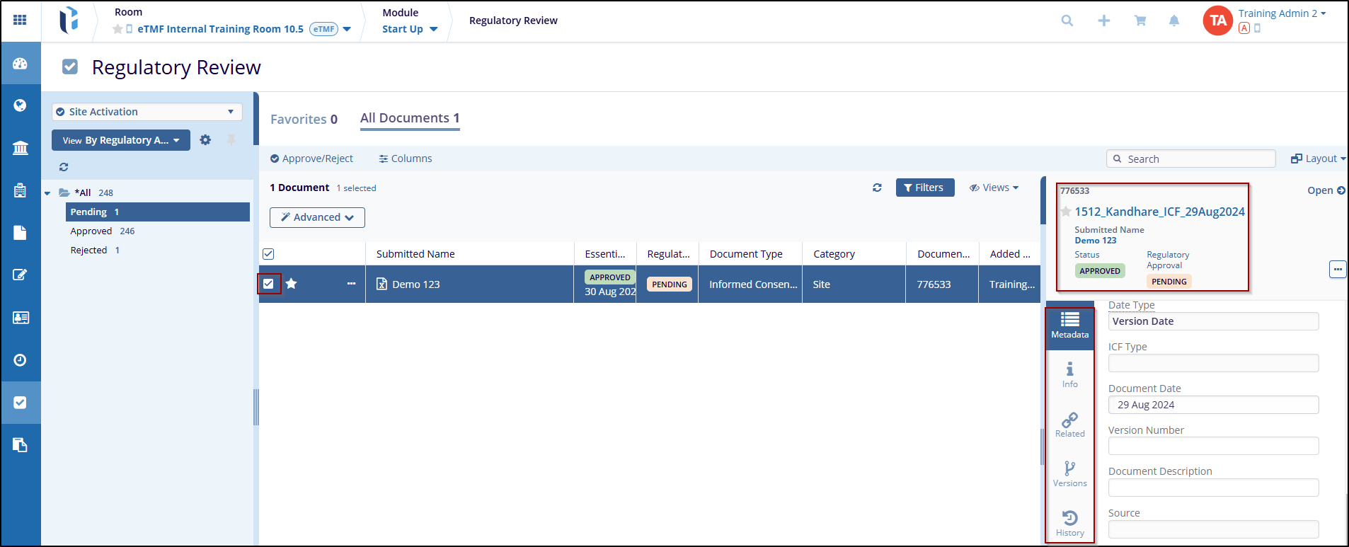 - Select a document by clicking on the checkbox, and the Metadata Panel on the right-hand side will open, displaying detailed information about the selected document.
