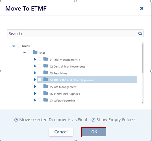- A Move to ETMF popup window is displayed.