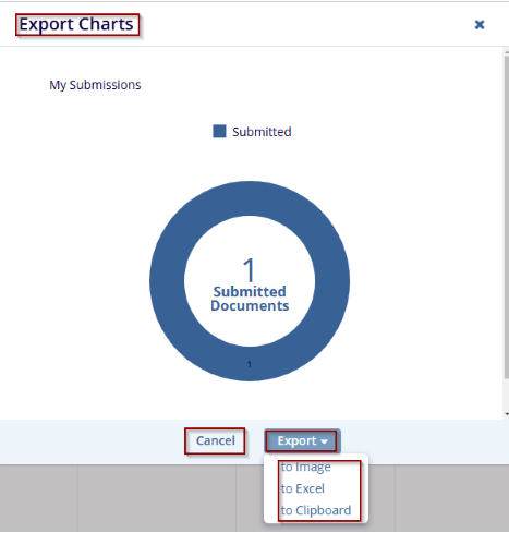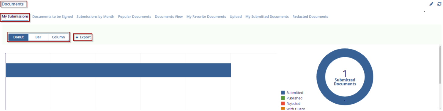 user can view the Submitted Documents Chart through the Donut, Bar, and