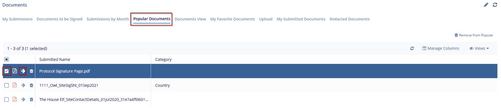 In the Documents Dashboard, select Popular Documents from the menu at the top. This view lists documents that are frequently accessed or marked as popular, along with details such as the Submitted Name and Category or Country. This is similar to My Submissions.