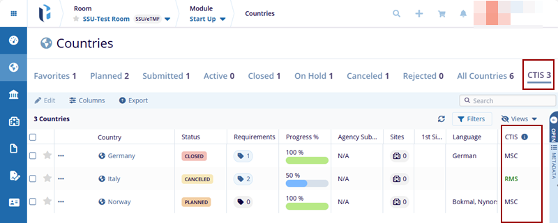 1. Click the Countries icon on the far-left side of the screen and click on the CTIS tab.