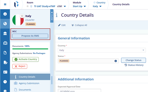 2. Click on the name of the country the Country Details page is displayed with the Propose As RMS (Reporting Member State) button up in the index panel.