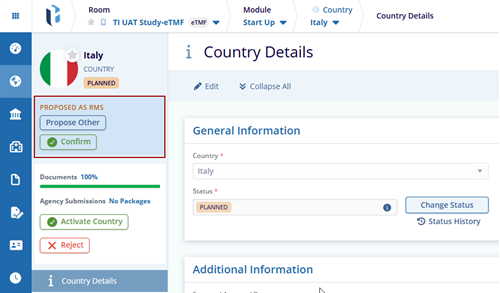 4. The user navigates to the Country Details page, and PROPOSED AS RMS text is displayed in the index panel with two additional options: Propose Other and Confirm.