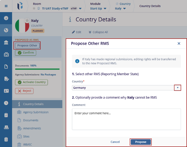 - The Propose Other RMS window is displayed. Expand the arrow of the Country field and