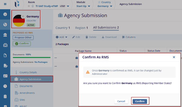Note: If the selected Country does not act as an RMS (Reporting Member State). Then the Administrator has the right to change the RMS (Reporting Member State) once confirmed.