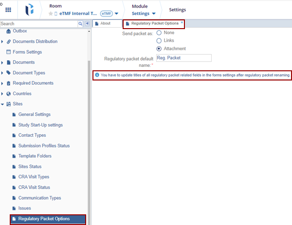 Located within the Sites folder, Administrators configure how Regulatory Packets are sent to Investigative Sites. Typically, template documents are sent as links to documents stored in the TI room or as email attachments. In certain cases, documents may be sent separately, not as links or attachments, in which case the Administrator selects the ‘None’ option. Generally, Administrators choose either the 'Links' or 'Attachment' option.