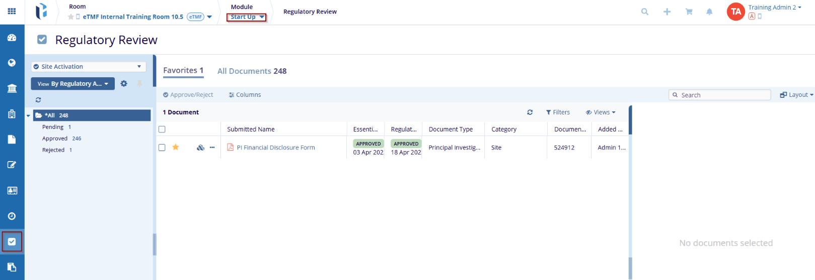 The Regulatory Review module allows users to view the review statuses of documents submitted for regulatory review, as well as review and approve the documents. The procedure for approving documents by the regulatory reviewer is discussed after a summary of the dashboard.