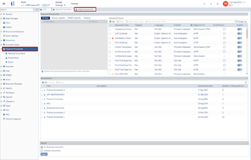 The Required Documents Settings allow Administrators to define and manage the required documents for a study. Some document types may be mandatory for all investigative sites, while others may be required only for sites in specific countries. These settings are typically configured at the start of a study but can be adjusted if needed during the study.