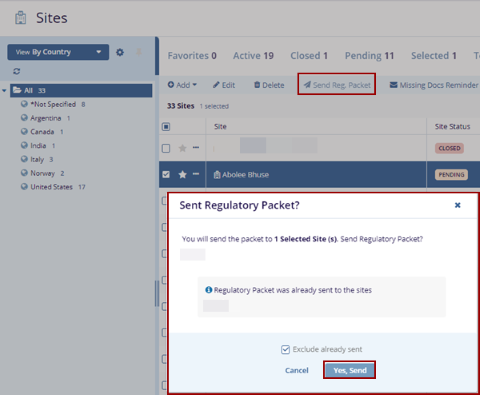 - The Sent Regulatory Packet? Popup window is displayed with the checkbox ‘Exclude already sent’ and Cancel and Yes, Send buttons.