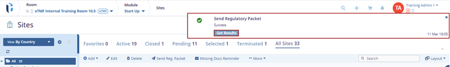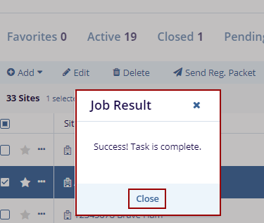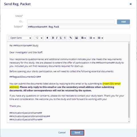 - Select a site by clicking on the checkbox and click on the Send Reg. Packet button on the top menu bar.