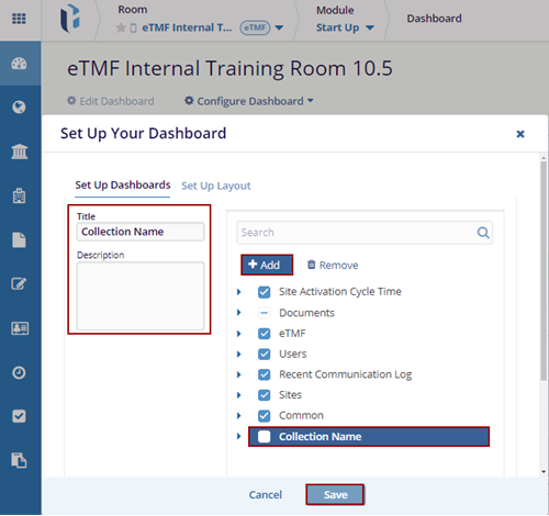 3. Click Add, and a new entry appears in the dashlet list as Collection Name. Enter the Title and Description in the left-side fields before adding the dashlet.
