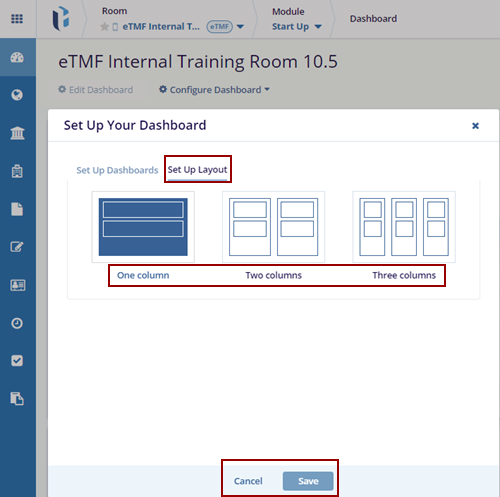 The Set-Up Layout allows users to customize the visual structure of the dashboard by choosing a column-based layout. This ensures that the dashboard is organized according to user preferences. The user has the option to select from one, two, or Three Columns.