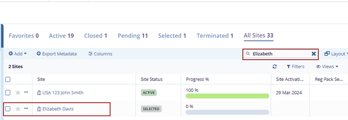 To search for sites from the grid pane, enter a search pattern in the Search textbox in the top ribbon bar and click the magnifying lens icon or press Enter. The system will display sites matching the pattern from both the Grid Pane columns and site profiles, including related contacts.