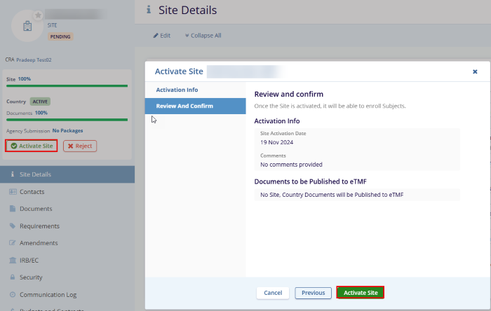 - Review and confirm the details in the pop-up window and click the Activate Site button.