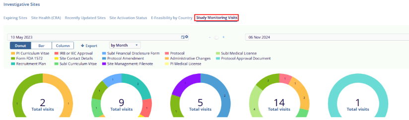 The Study Monitoring Visits tab provides a breakdown of the monitoring visits conducted over specific periods. Users can view visit data by month and year, with each circular chart displaying the total number of visits for that time and color-coded segments representing various document types (e.g., PI Curriculum Vitae, Protocol Amendment, Administrative Changes). The tab offers flexibility to change the chart type between Donut, Bar, and Column views, and an Export button to download the data. The date range can be adjusted using the date fields to focus on specific periods, helping users track and analyze visit trends over time.