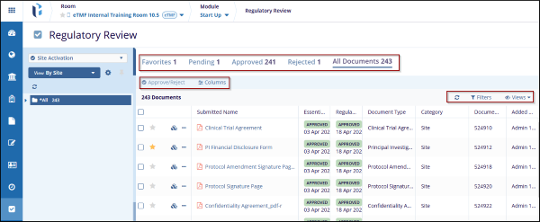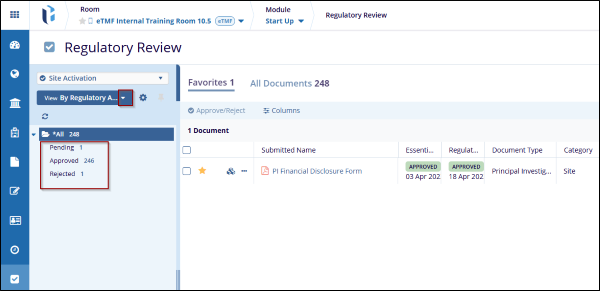 • By Regulatory Approval Status: The By Regulatory Approval Status groups all the documents as per their review status, i.e., Approved, Rejected, and Pending. Clicking a review status group from the left panel will display the documents belonging to the particular review status group in the grid pane.
