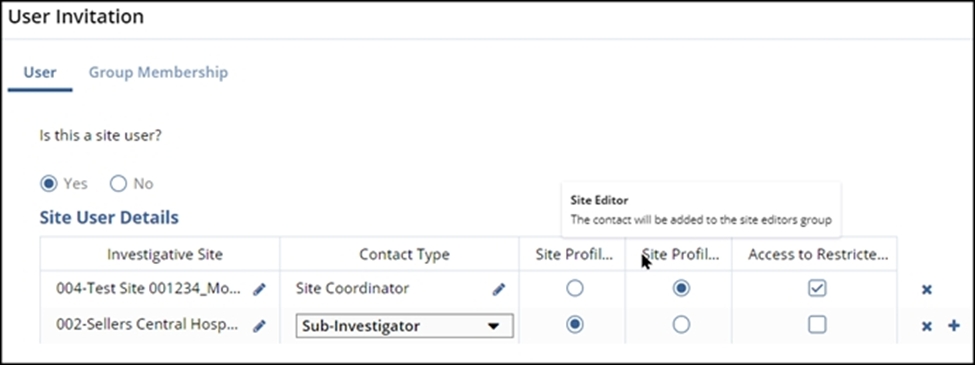 - Choose an Investigative Site, followed by the Contact Type to be assigned to the user for that Site.