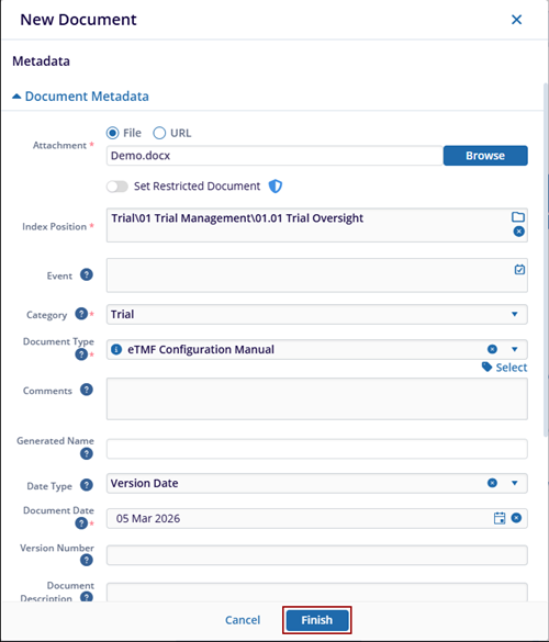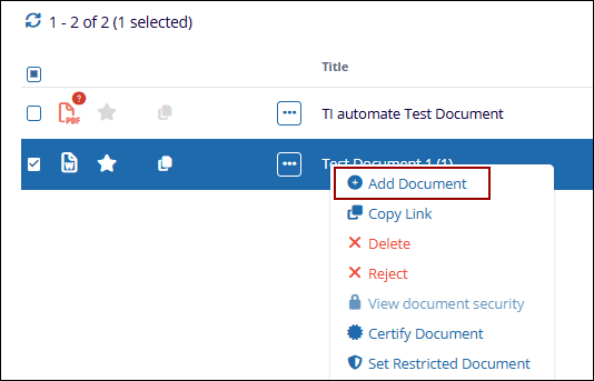 Users with sufficient access (editors and above) can open the Document Activities Menu and select the Add Document option. In locations within Trial Interactive where this is an option, the system will open an import interface that will apply the coding relevant to the placeholder so that the document can be added to the system pre-coded.