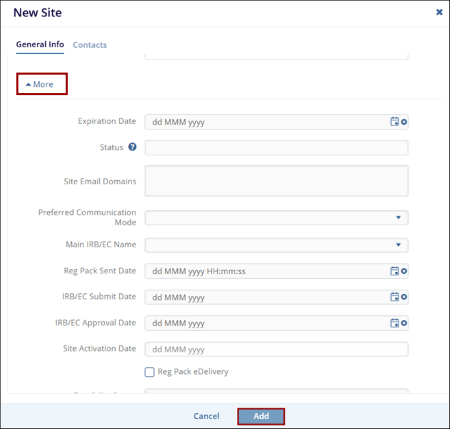 - Click the +Add button to create a new site. This opens the New Site form.