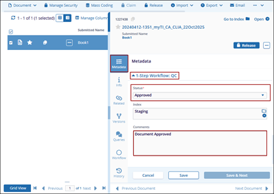 - If the workflow has multiple stages configured, the document becomes available for review to the users assigned to the subsequent stage.