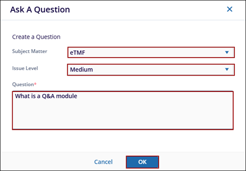 Users can create questions either by navigating to the Documents tab within the eTMF module to create a document-specific question, or by accessing the Q&A module to create a general question.
