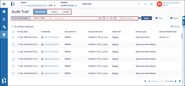 An Audit Trail is a security-relevant chronological set and source of records that provide evidence of the sequence of activities performed over a document. The changes made in a document by all users are displayed within the Audit Trail.