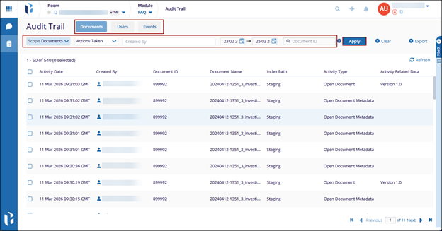 An Audit Trail is a security-relevant chronological set and source of records that provide evidence of the sequence of activities performed over a document. The changes made in a document by all users are displayed within the Audit Trail.