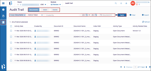 Users can access the Audit Trail by selecting it from the menu bar on the left side of navigation pane. The audit trail functionality is available for users with Administrator access.
