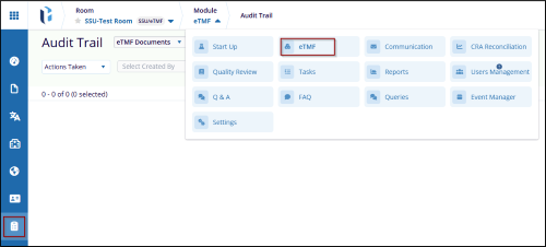 - On the eTMF screen, navigate to the left-hand menu and select the Audit Trail