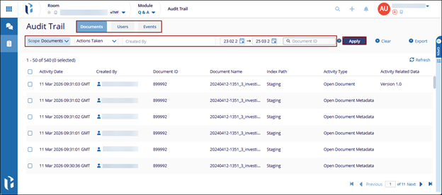 An Audit Trail is a security-relevant chronological set and source of records that provide evidence of the sequence of activities performed over a document. The changes made in a document by all users are displayed within the Audit Trail.