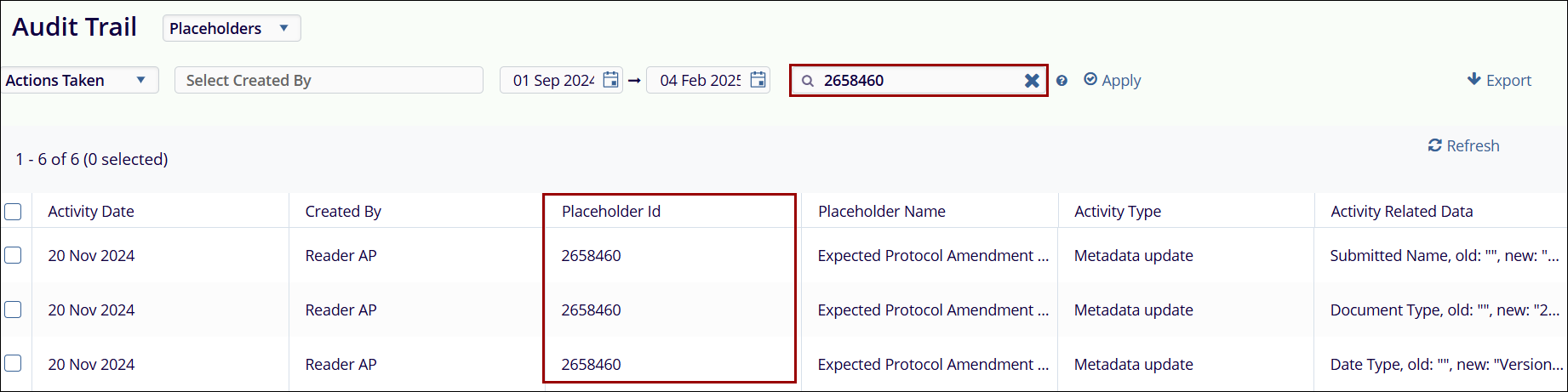 - Placeholder ID: The Placeholder ID field allows users to retrieve audit trial
