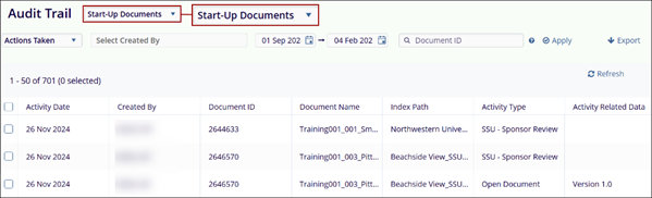 User Interface for Start-Up and eTMF documents: When the audit trail for Start-Up