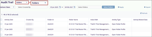 Folders: When the audit trail for Folders is retrieved, the data is presented in