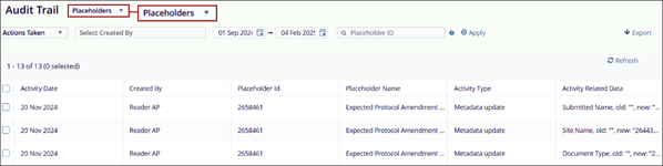 Placeholders: When the audit trail for Placeholders is retrieved, the data is