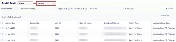 Users: When the audit trail for Users is retrieved, the data is presented in the