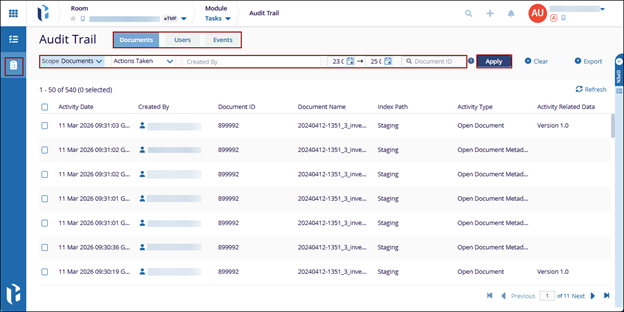 Users can access the Audit Trail by selecting it from the menu bar on the left side of navigation pane. The audit trail functionality is available for users with Administrator access.