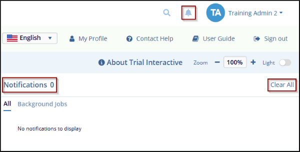 The total number of notifications for your current Trial Interactive (TI) session is shown in a red circle next to the bell icon in the top-right corner of the screen.