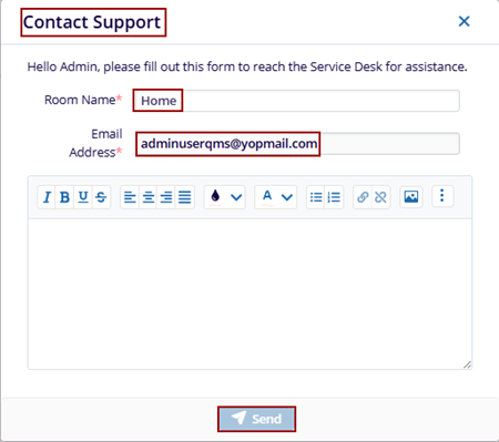 This opens the Contact Support window, which allows user to enter the details for the request needed and send it to the service desk.