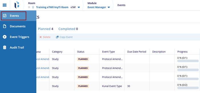 - Planned: This tab displays the planned events, with the event name, event type, planned date etc.