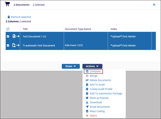 - On the Documents Cart window, click on the Actions dropdown and select the