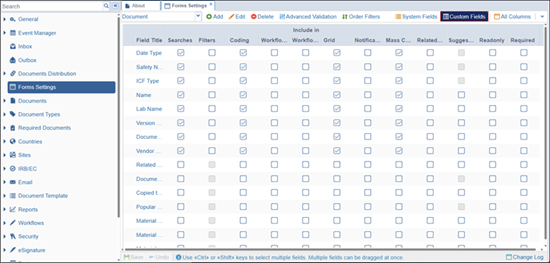 On the Forms Settings page, administrators can add, edit or delete custom metadata fields as well as configure their availability and visibility across the system.