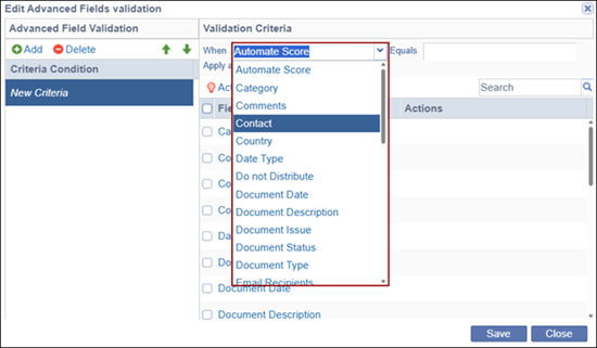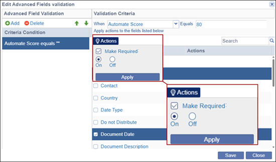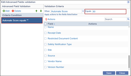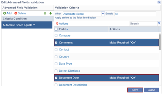 - In the above example, the validation rule is defined as: When Automate Score is set to 80, the Comments and Document Date fields becomes required.
