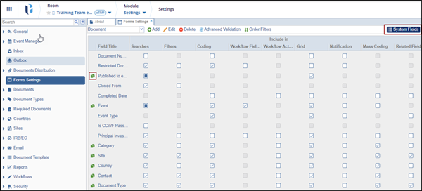 System fields are metadata fields that are predefined and managed by the system rather than created by users. Users can modify how these fields are used and whether they are available by selecting or clearing the corresponding checkboxes on the Forms Settings page. A green icon indicates that the field has an associated related field.