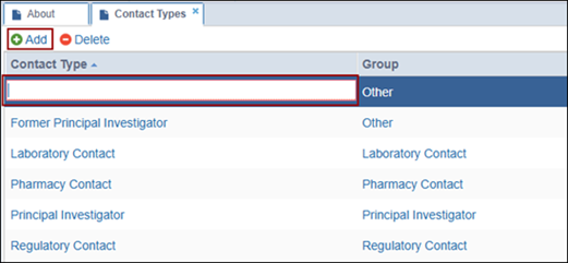 - On the Contact Types settings page, click +Add from the top menu bar.