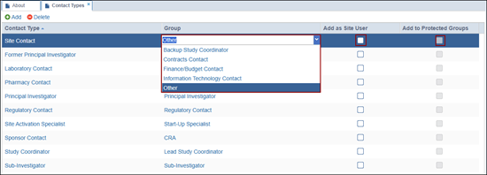 Within the Contact Types settings section, administrators can add and delete contact types along with adding them as site users or to the protected groups.