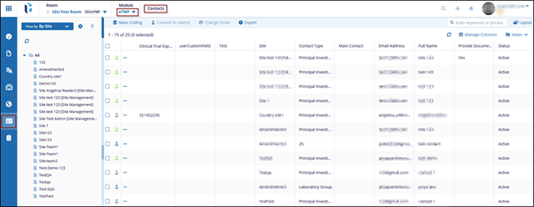 The contacts assigned to a site are shown in the Contacts modal within the eTMF module. Users with the necessary access permissions can edit contacts, apply mass coding, convert contacts into users, and export contact details and metadata.
