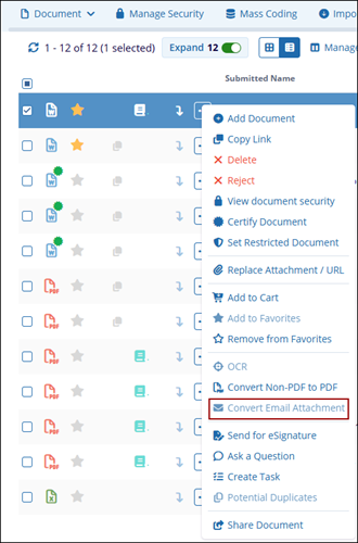 The Convert Email Attachment option allows users to convert an email file (such as .msg or .eml) along with its attachments into a standard document format within the system.