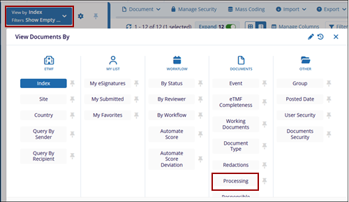 - Access the View by dropdown and select the Processing view in the Documents