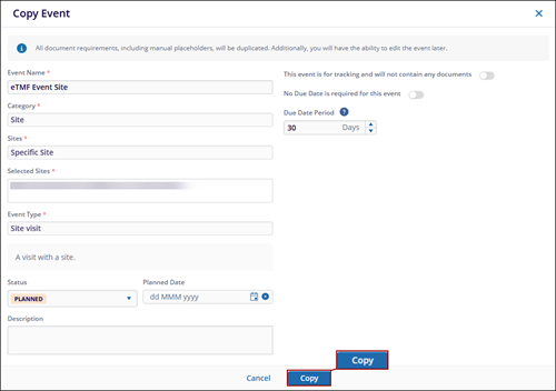 Note:- While copying an event, users can modify the Event Name, Status, Planned Date, Description, and Due Date; however, the Category and Event Type fields remain non-editable.
