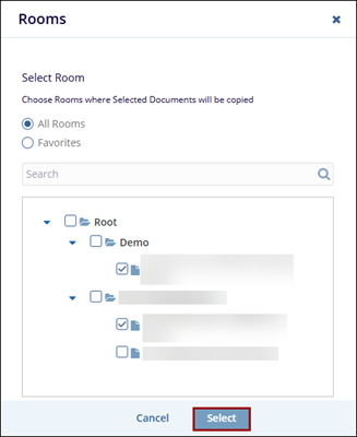 - On the Copy Documents screen, click on the Select button to add rooms.